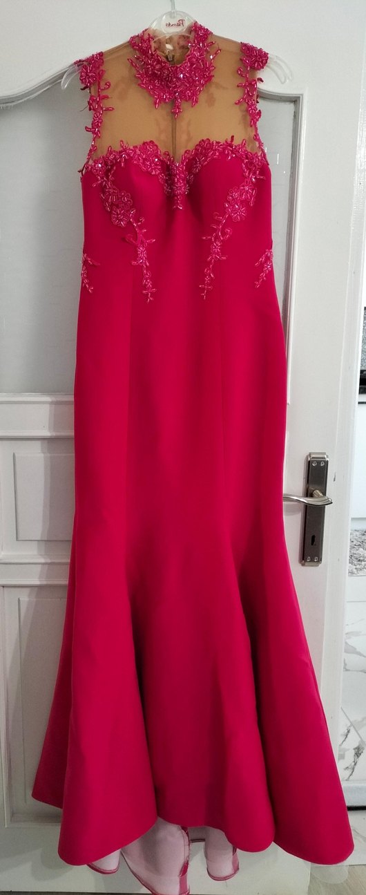 Fuşya renkli, straplez ve kolsuz bu abiye elbise, boncuk işlemeli desenleri, kuyruklu balık detaylarıyla şık bir görünüme sahiptir.