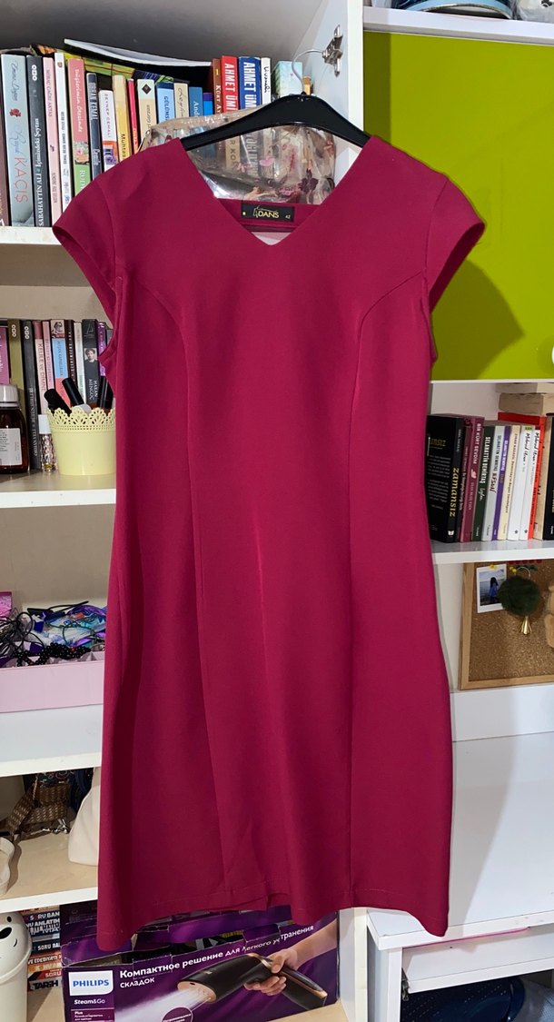 Fuşya parlak renkli, v yaka ve kısa kollu, drapeli,ipek dokulu, normal boy, dar kesim . Ofis için uygundur.