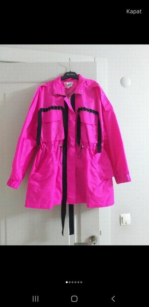 Parlak fuşya renkli, kemerli ve askılı kollu, bol kesim mini kadın yağmurluğu. Notlu yaka ve iki cep detaylı, sokak modasına uygun.