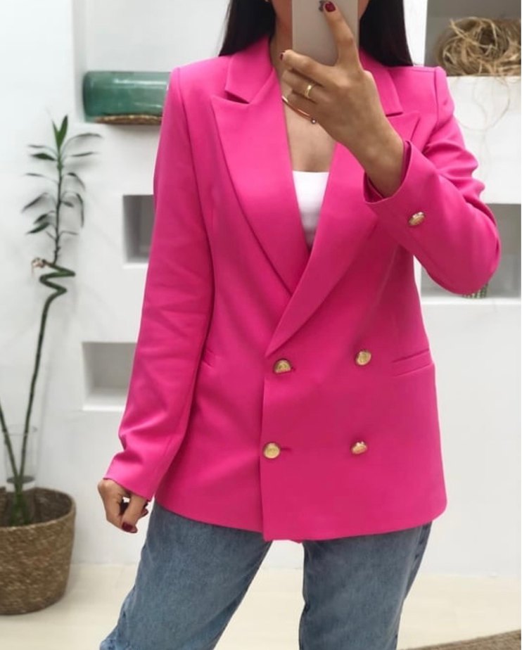 Fuşya pembe renkli, düğmeli, uzun kollu kadın blazer ceket. Normal boyda ve regular fit, ofis ve günlük şıklık için uygundur. Bedeni olmadığı için satışta bir problemi yok