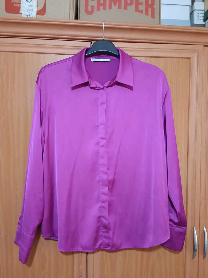 Fuşya pembe Düğmeli Saten Kadın Gömlek
