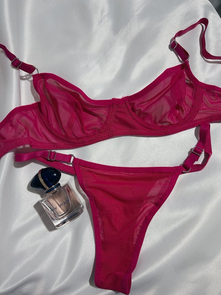 Canlı pembe renkte, kısa uzunlukta ve desensiz, Paris tarzı modern sütyen takımı. İnce ve şeffaf kumaş kullanılmış. Hijyen açısından iade kabul edilemez. Ürünler sıfırdır. 75-80-85-90 bedenleri mevcuttur.