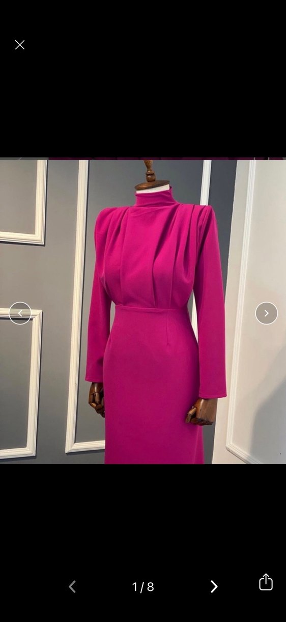 Gamze kahrıman fasion markalı, Fuşya pembe renkli, uzun kollu vatkalı şık bir elbise. Özel günlerde veya davetlerde giyilebilir. Sadece bir kez giyildi boyum 170cm uzunluğu fotoğraftaki gibi oluyor. Şalı ile beraber gönderilecek.