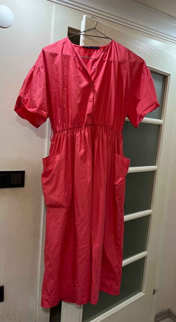 Keten kumaştan, parlak kırmızı renkte, düğmeli ve V yaka midi boy bol kesim elbise. Kısa kollu ve cepli, minimalist normcore tarzında günlük kullanım için uygun.
