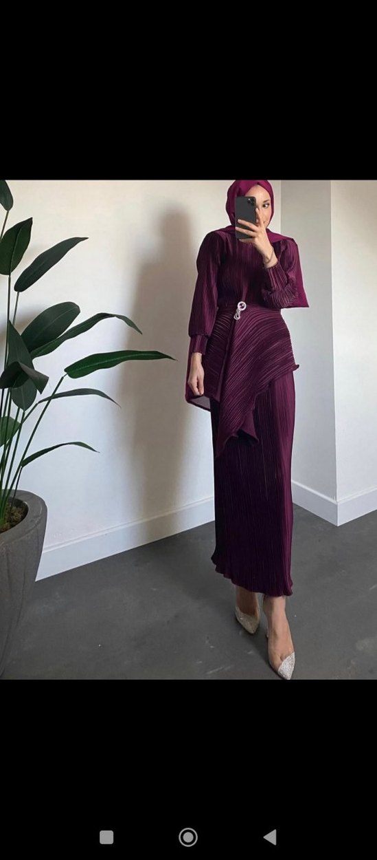 Fuşya renkli, uzun kollu, yüksek yakalı piliseli uzun elbise. İpek dokulu kumaştan, düzenli kesimle ofis için uygundur. ✨ Şalı ile birlikte göndereceğim