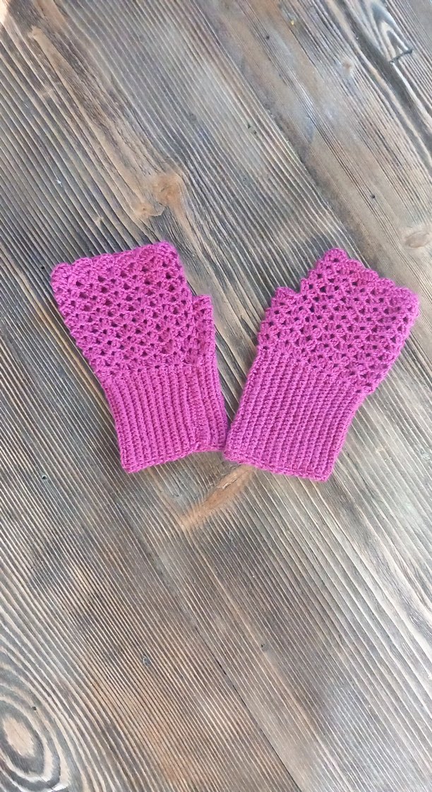 Fuşya rengi, örgü kadın eldivenleri, yumuşak iplikten örülmüş ve bohem tarzda delikli desene sahip. Rahat ve retro bir görünüm sunar.