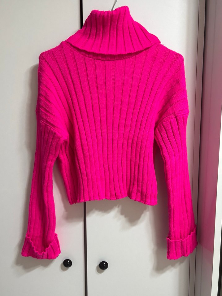 Rengiyle enerji saçan, yumuşacık ve çok şık bir parça! Modern kesimi ve kalın fitilli (ribanalı) dokusuyla hem spor hem de şık kombinleriniz için ideal. Hiçbir kusuru, söküğü veya lekesi yoktur; yeni gibidir. Ölçüler & Detaylar: • İki Koltuk Arası (Genişlik): 50 cm • Boy (Omuzdan Eteğe): 45 cm • Model: Balıkçı yaka, hafif düşük omuzlu, crop kesim. • Durum: Sorunsuz, tertemiz ve yeni.