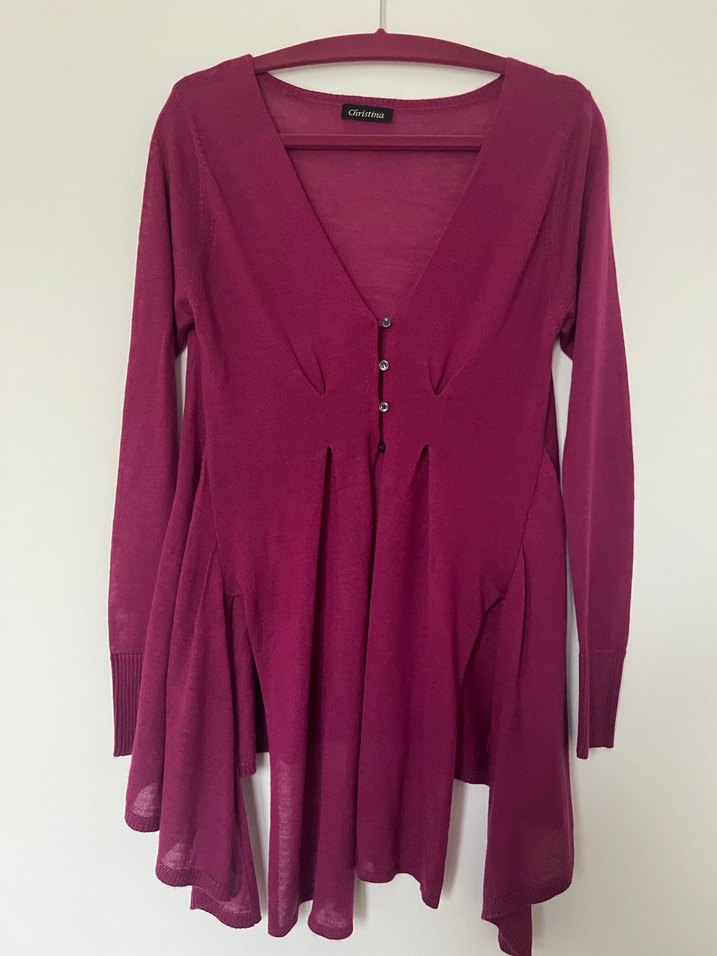 Temiz şık çok amaçlı V yakalı fuşya hırka Yanlarda iki pilli ve bir yırtmacı var önlerde yukarı ve aşağı iki pillisesi var Ön arkaya göre biraz daha uzun Ölçüleri: kol altı beden genişliği:45 Omuzdan yan uzunluk:85 Omuzdan arka uzunluk: 70 Bir yan foto çekmiştim Öbür yan da aynı