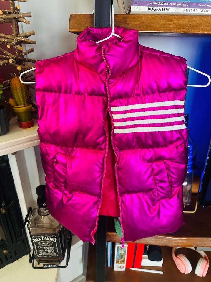 Fuşya renkli, yüksek yakalı ve fermuarlı, yumuşak ve sıcak kumaştan yapılmış, kolsuz ve normal boyda kız çocuk yelek. Outdoor kullanıma uygun.