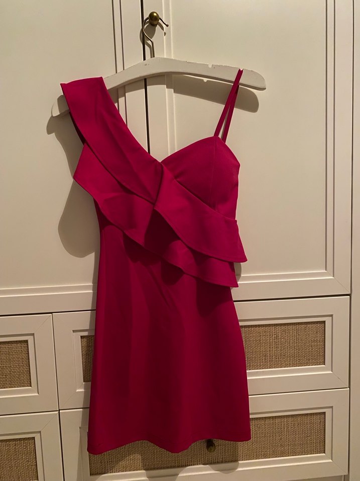 Fuşya renkli, straplez yaka ve ince askılı, fırfırlı detaylı, vücuda oturan midi boy elbise. Romantik akşamlar için uygun.