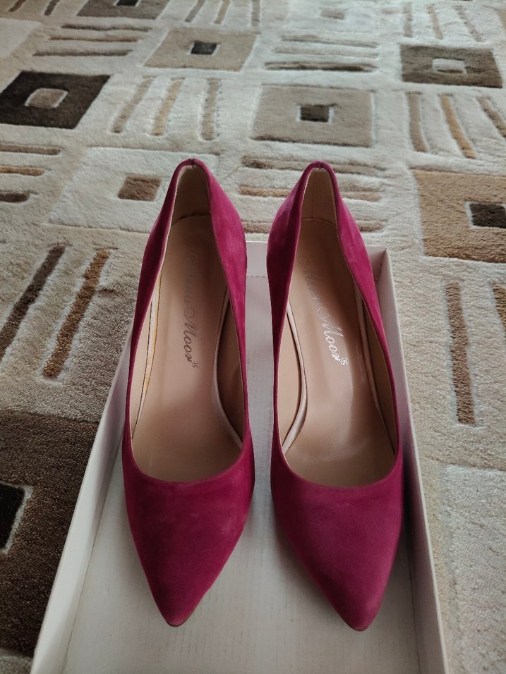 Fuşya süet stiletto topuklu kadın ayakkabı, parlak ve desensiz tasarıma sahiptir. Düğünler için modern klasik ve zahmetsiz şıklık sunar.