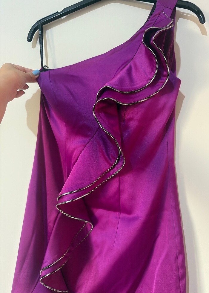 Fuşya rengi, tek yollu, fırfır detaylı mini abiye. 1 kez giyildi. 36-38 uyumludur. tek omuzdan boy 81, omuzsuz taraftan 64 cm. Gögüs 38-40 cm. Bel 36*2. Elbise birazcık likralı saten.