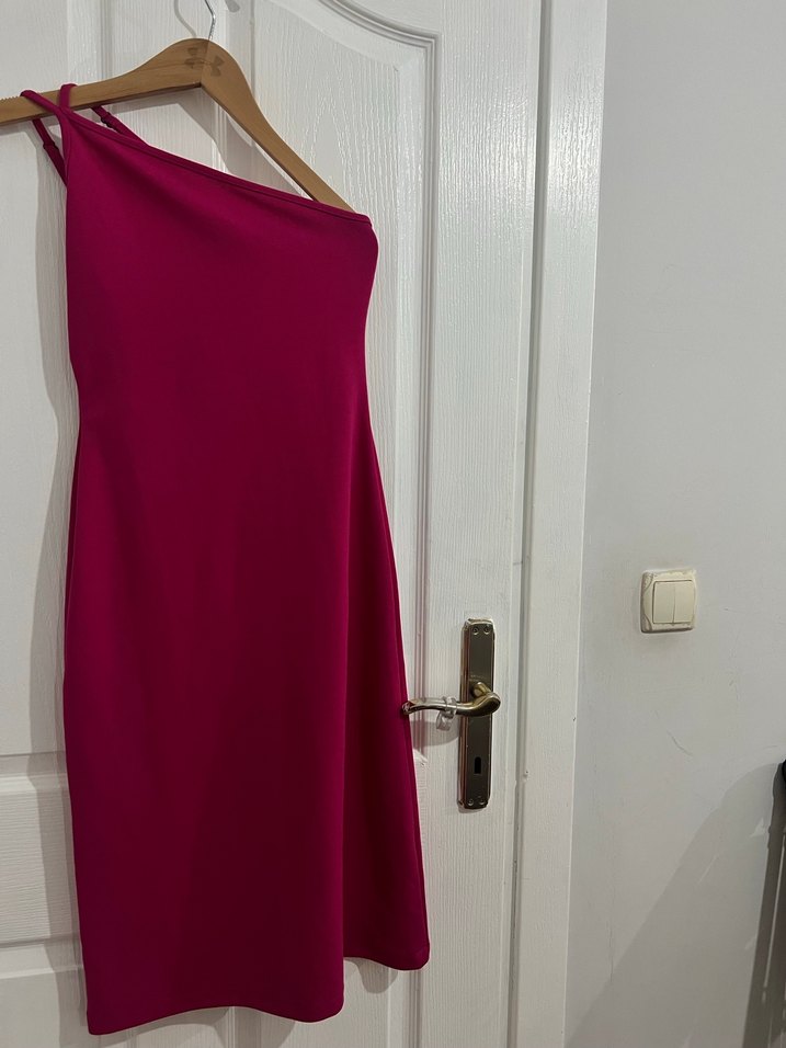 Fuşya renk, krep detaylı, tek omuz ve uzun midi boy elbise. minimal tasarımıyla romantik akşamlar için uygundur. Kolsuz kesim şıklık katıyor.