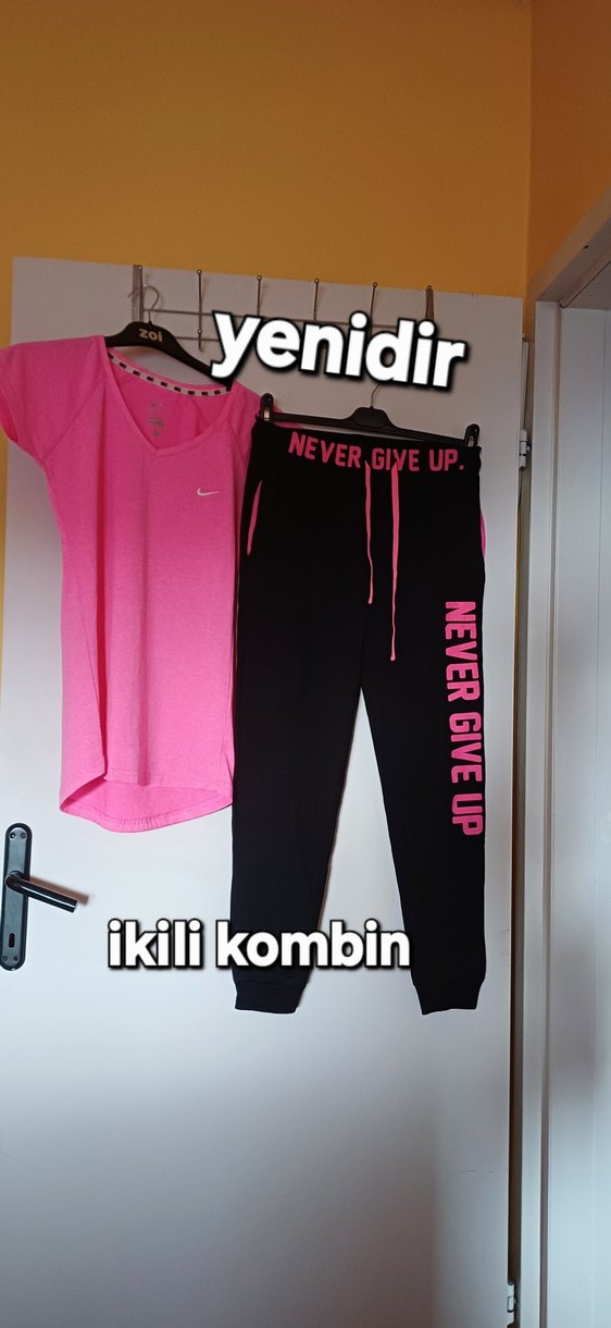 Gardrobumda ne görüyorsanız onu alırsınız, kusuru var ise mutlaka belirtilir katiyetle gizlenmez, dolabımda pişmanlık yaşamazsınız. Detaylar fotoğraf üzerindedir, sormak istedikleriniz için buradayım. eşofman altı etiketinde XS yazar, deneyerek 36 beden olarak aldık, yine de verdiğim ölçülere göre alım yapınız. eşofman üstü ise M bedendir. İkisi de yenidir, kullanılmamıştır. Güle güle kullanılsın #kombin #eşofman #takım #eşofman #altı #üstü Pembe kısa kollu tişört ve siyah polar kumaşlı, bol kesim eşofman altı, pembe "NEVER GIVE UP" yazılı ve detaylı set.
