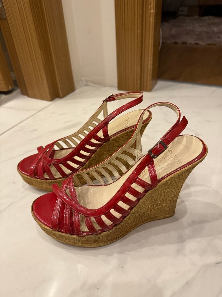Parlak kırmızı renkte, tokalı bantlı ve mantar dokulu dolgu topuklu kadın ayakkabısı. Romantik geceler için uygun.