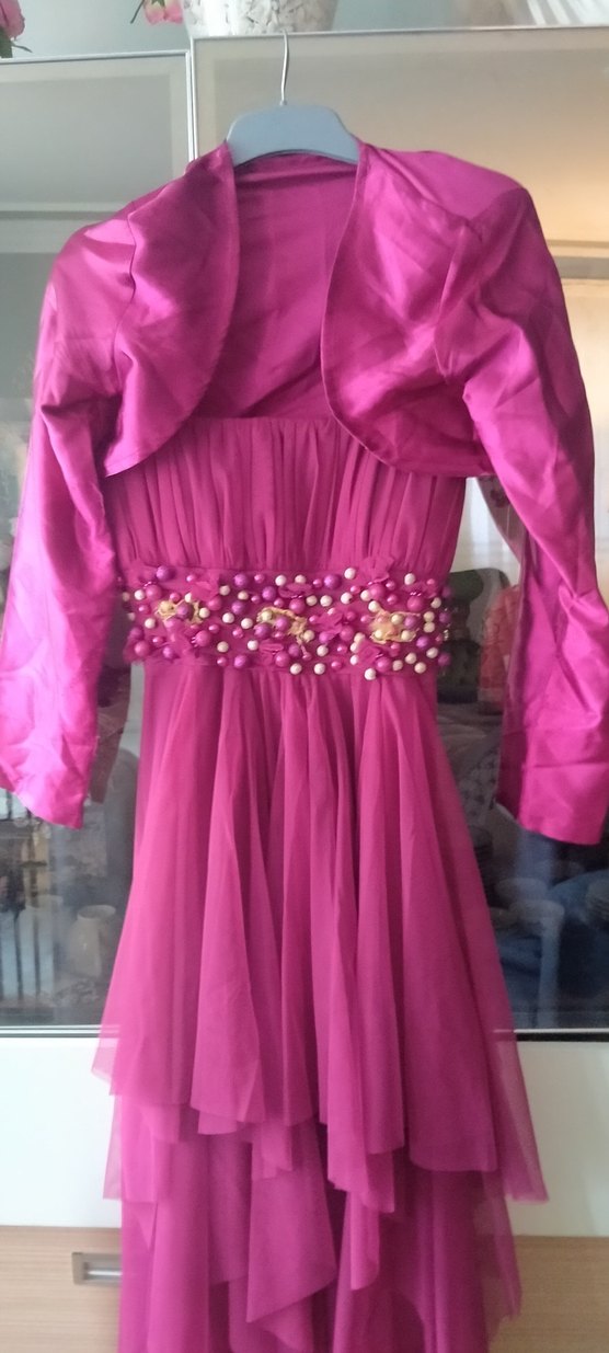 Parlak pembe, drapeli ve vücuda oturan uzun abiye elbise. Askılı kollu, straplez yakalı ve detaylı bel süslemeli. Düğünler için uygun. Bolerosu ile tesettürlü giydim isteyen açık olarak giyebilir.Hiçbir kusuru yok