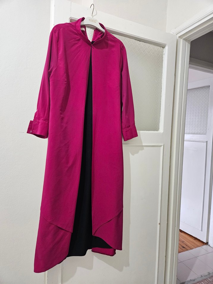 Bordo renkli, uzun drapeli ı, yüksek yakalı ve uzun kolludur. İpek gibi kumaştan, düzenli kesimlidir ve ofis kullanımı için uygundur. Çağdaş tarzı ve koyu desensiz rengi avangart bir görünüm sunar.