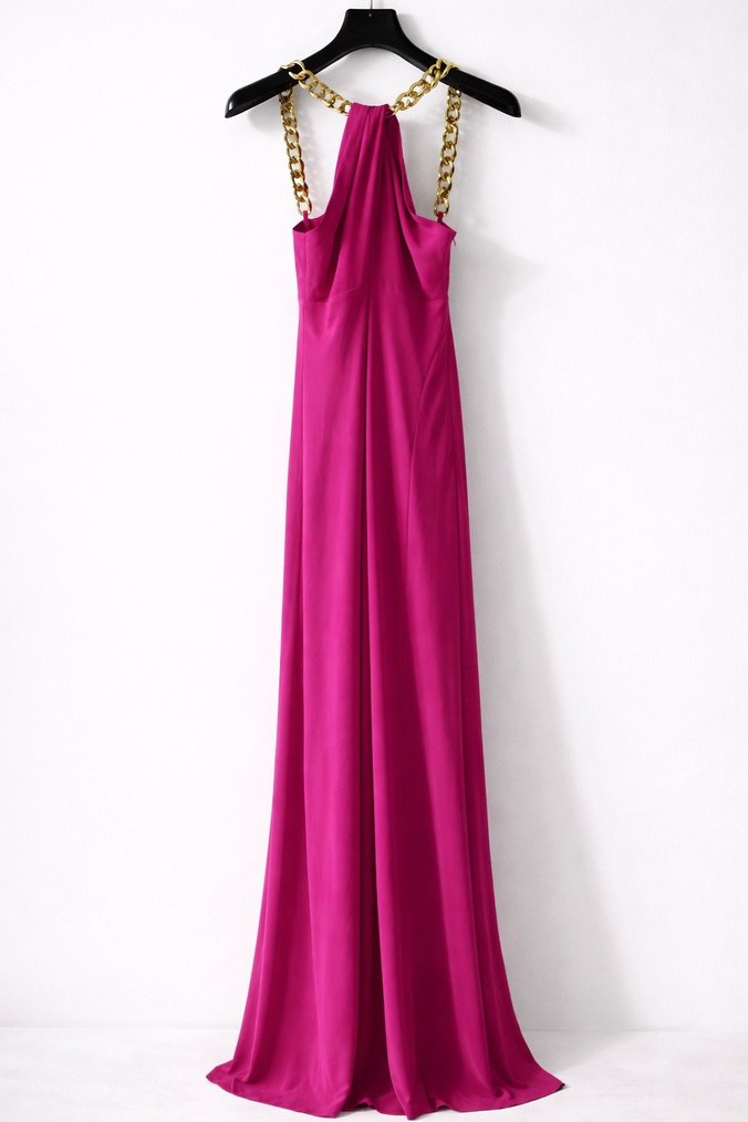 Fuşya, uzun ve dar kesim abiye elbise, straplez yaka ve drapeli detaylarla birlikte altın zincir askılara sahiptir.