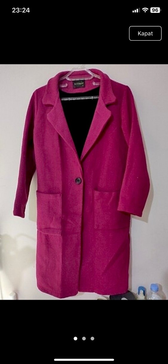 Fuşya uzun kesim kadın kaban, yumuşak ve sıcak kumaştan, düğmeli ve cepli. Rahat kalıp ve uzun kollu, günlük sokak stili için uygun.