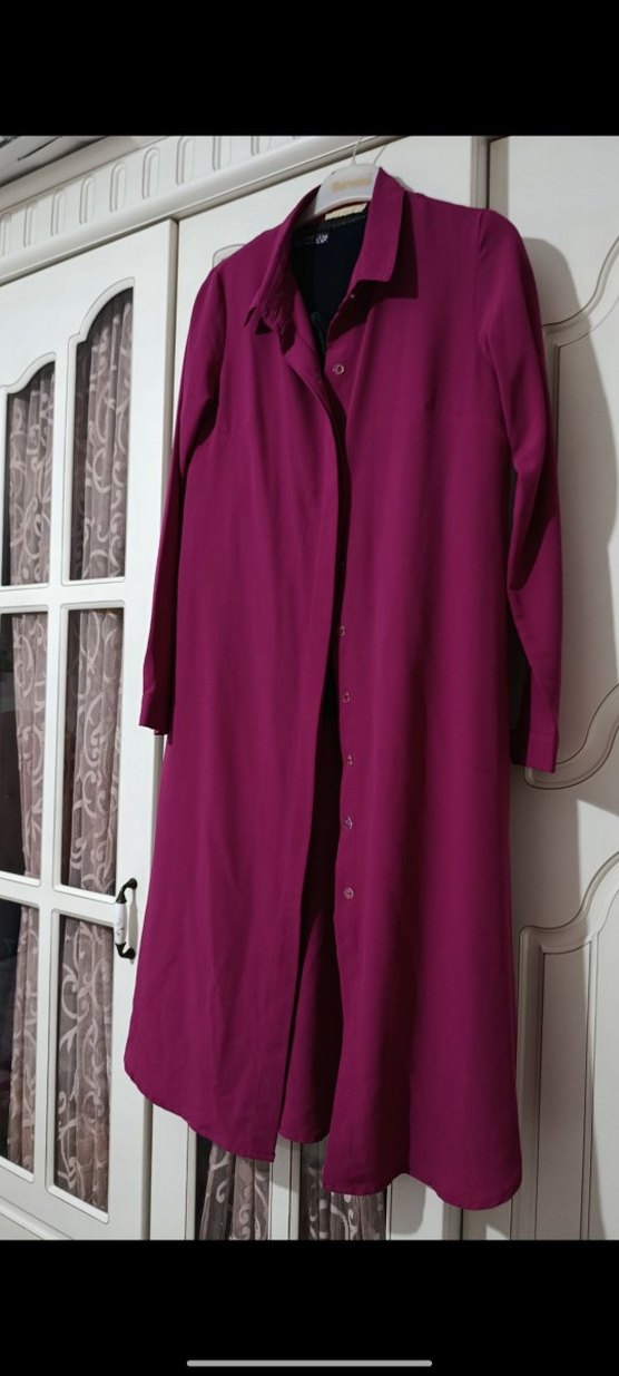 Koyu mor renkte, uzun kollu, dökümlü ve geniş kesimli İpek gibi kumaştan, sade ve günlük kullanıma uygun.