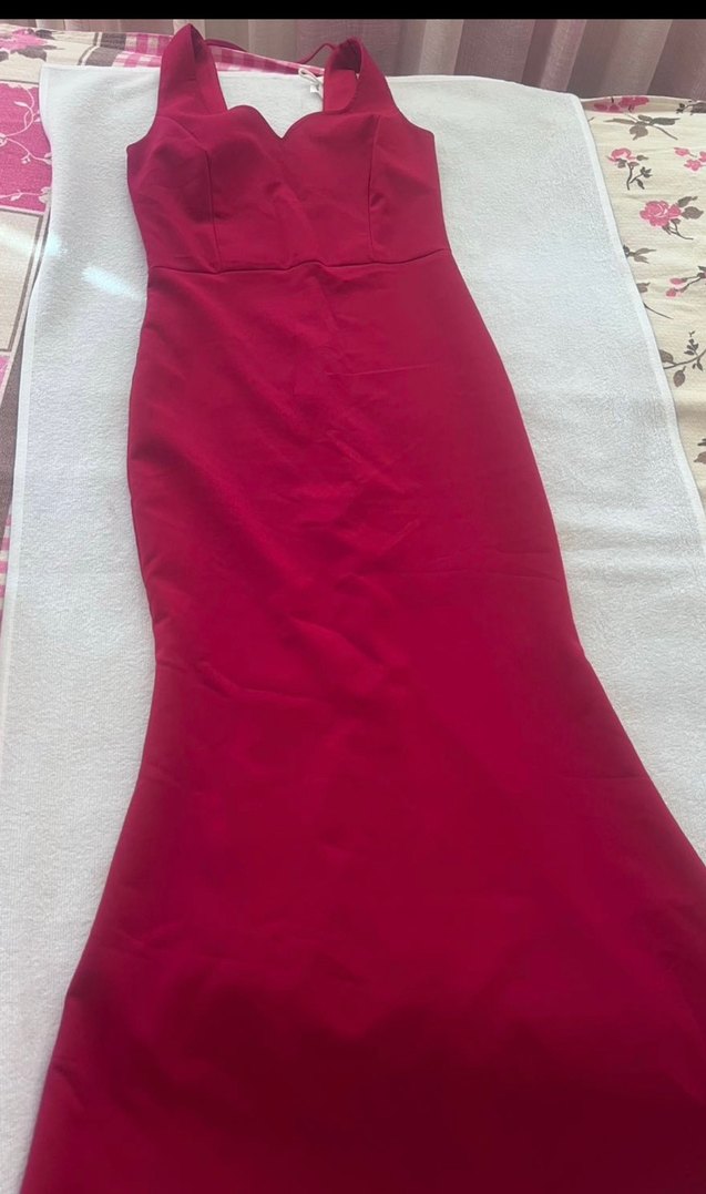 Fışya renkli, V yakalı ve drapeli detaylara sahip, kolsuz, uzun ve vücuda oturan abiye elbise
