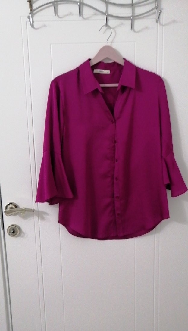 Bu canlı pembe , saten görünümlü kadın gömlek V yakalı, düğmeli ve uzun kolludur. Kol uçları volanlı şık bir tasarıma sahip..