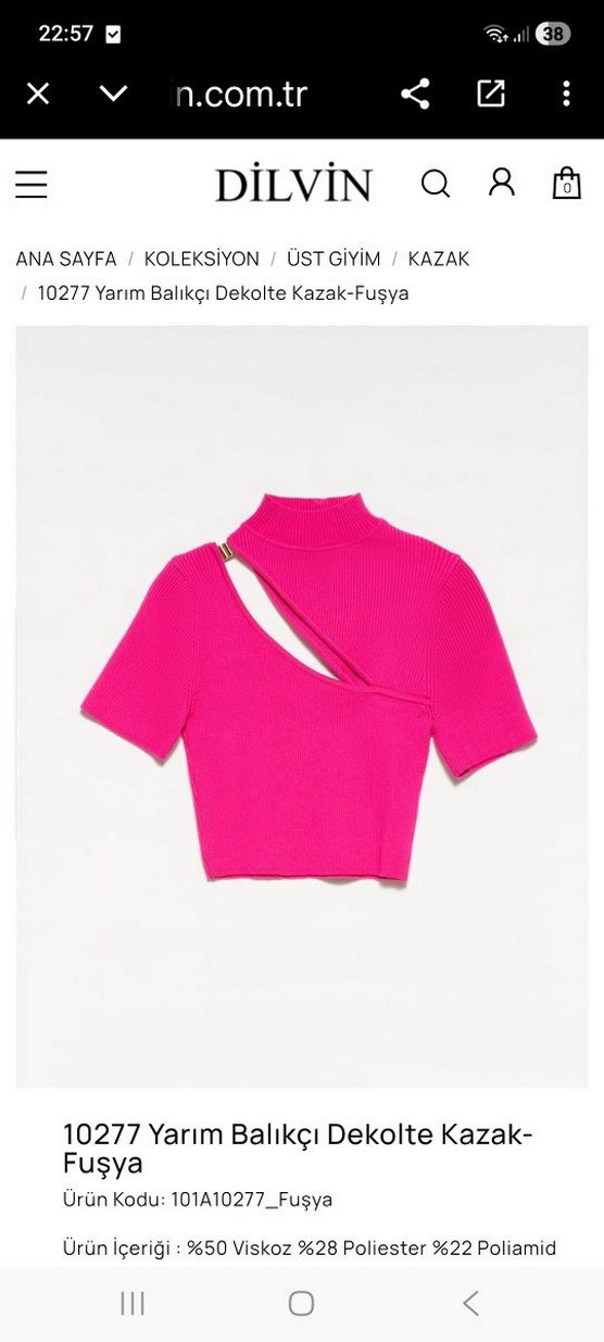 Yarım balıkçı yaka ve kısa kollu, sıkı kesim fuşya renkli örgü crop top. Ön kısmında kesik detay bulunur, sokak ve athleisure tarzı bir arada. STD.BEDENDIR 42 BEDENE KADAR UYUMLUDUR..
