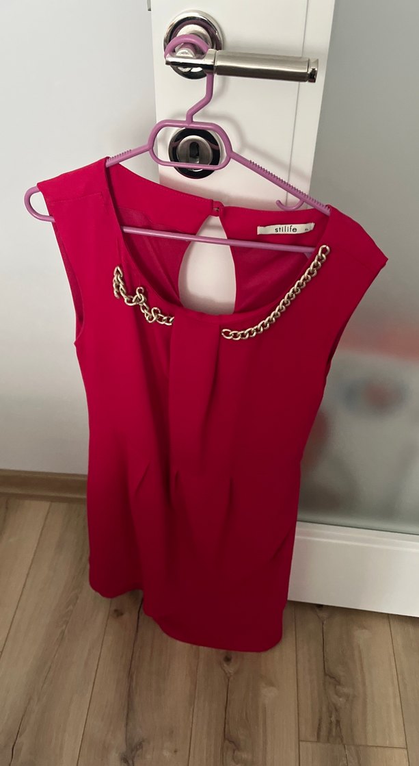 Kırmızı, parlak kumaştan, zincir detaylı, V yaka ve kolsuz, vücuda oturan midi elbisedir. Günlük kullanıma uygundur. Sadece yakasında zincir yeri dikişinden çıkmış ama elle bile tutturulur