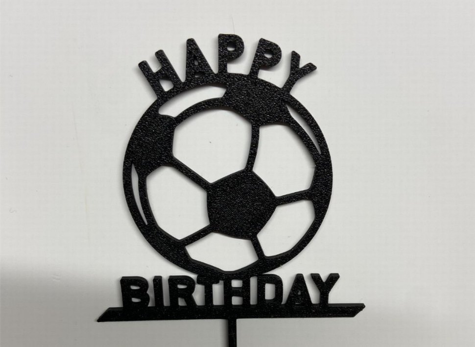 Siyah renkli futbol topu şeklinde "Happy Birthday" yazılı doğum günü pastası süsü. Futbol temalı kutlamalar için uygundur.