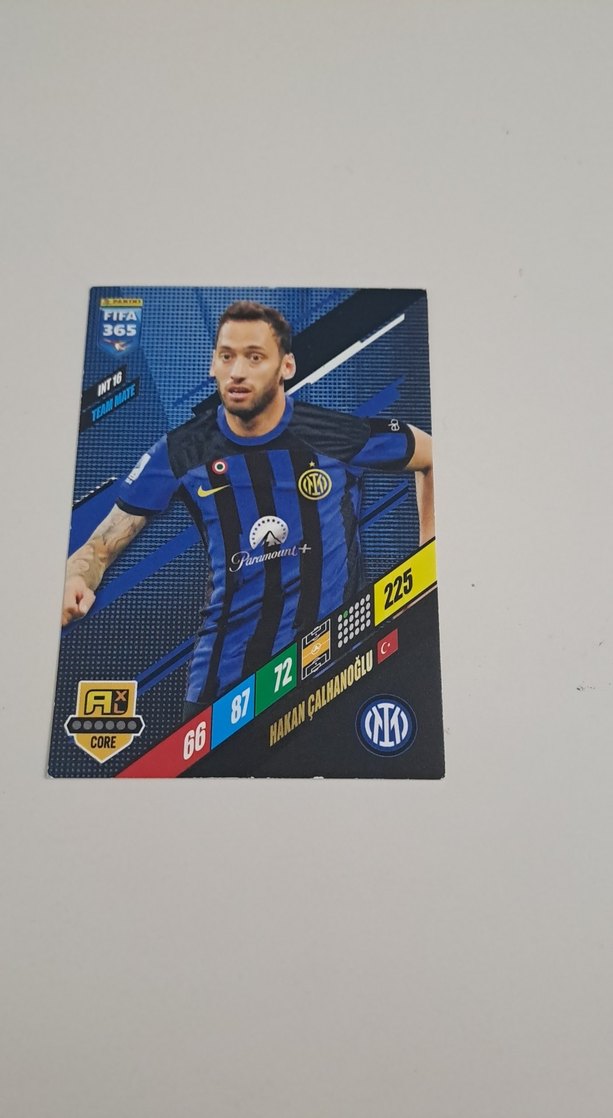 Hakan Çalhanoğlu'nun Inter Milan formasıyla yer aldığı koyu mavi futbolcu kartı, oyuncu istatistikleri ve takım logosunu içerir. ⚽