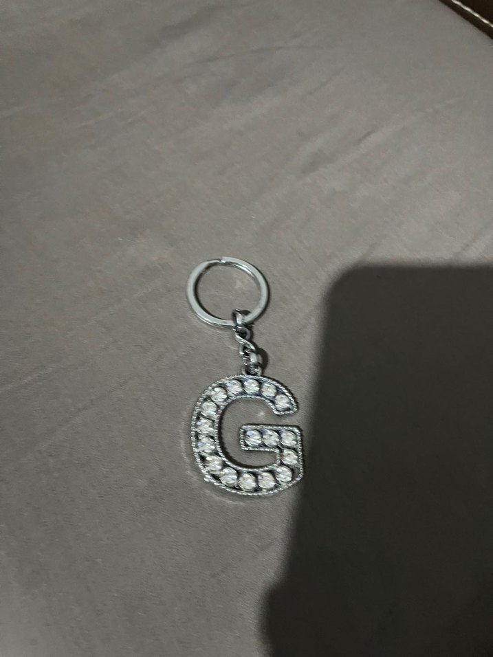 Zincir detaylı, taşlarla süslenmiş 'G' harfi figürlü gri anahtarlık, minimalist sokak stilini yansıtıyor.