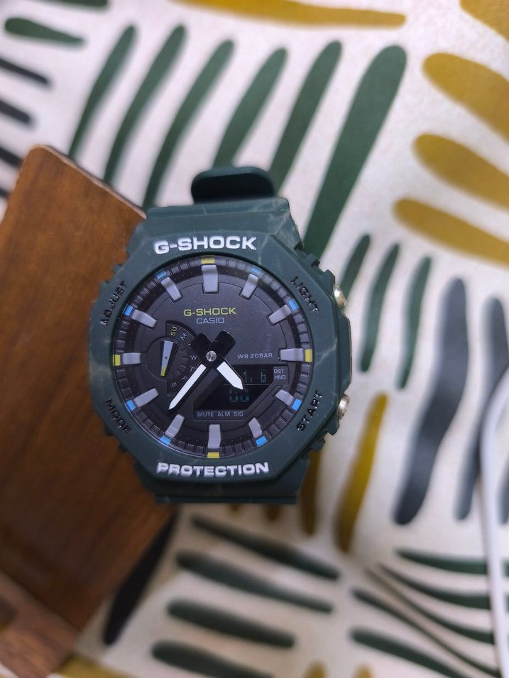 G-Shock erkek saati, koyu yeşil renkte ve sokak tarzına uygun. Koruma özellikli ve çok fonksiyonlu bir modeldir. ⌚