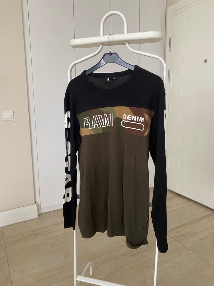 G Star Raw marka uzun kollu tişört...Aqua Florya G Star Raw mağazasından alınmıştır... Kolları ve göğsü yazı desenli...parçalı siyah ve haki renkli...kamuflaj detaylı...