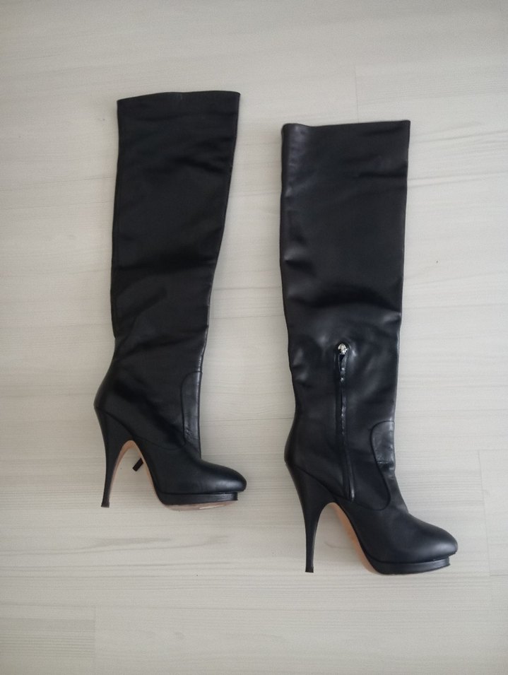 Siyah deri dizüstü çizme, ince topuklu ve yan fermuarlı. Minimalist ve gotik tarzda, günlük kullanıma uygun.