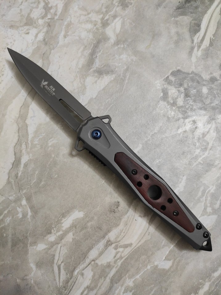 titanyum, ahşap detaylı yarı otomatik çakı, fonksiyonel ve şık tasarıma sahip. 22cm uzunluk kemer klipsli