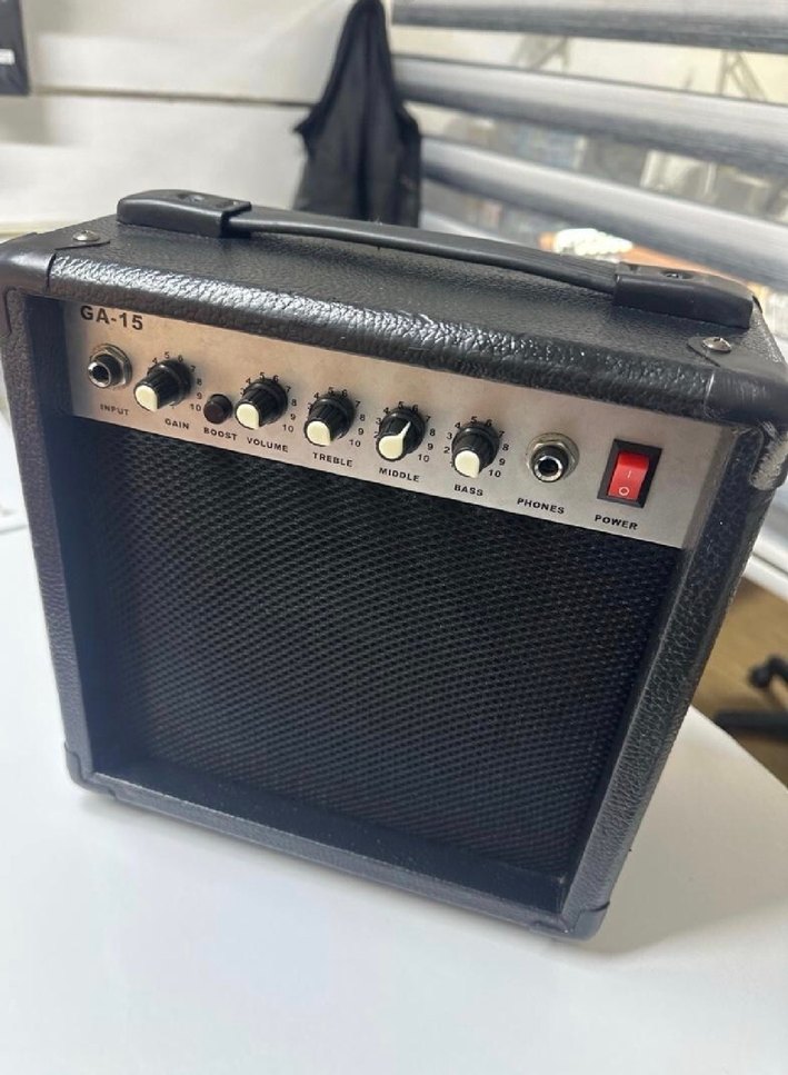 GA-15 müzik sistemi, gain, boost, volume, treble, middle ve bass ayarlarına sahip. Giriş ve kulaklık jakları ile güç düğmesi bulunur. Siyah ve kompakt tasarım.
