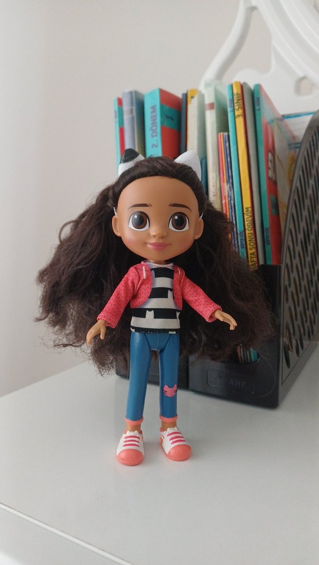 Uzun kahverengi saçlı, gri siyah çizgili tişört, pembe ceket, mavi pantolon ve pembe ayakkabılı bebek figür. ürün yurtdışından alındı rafta sergilendi.orjinaldir Alana hayırlı olsun