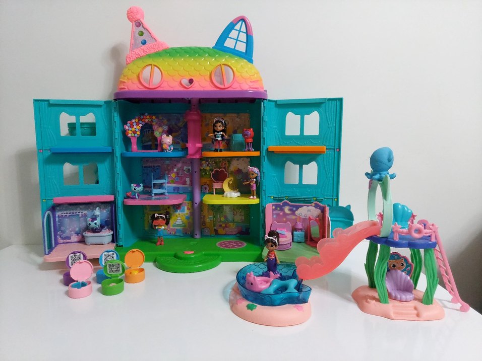 Görsellerdeki tüm parçaları dahildir. Hepsini ayrı ayrı alıp birleştirdik. Ekstra iki oda bir aquapark aquaparkın orijinalinde olmayan kedili salıncağı da biz ekledik. Kutlama konseptinin arkasındaki yıldızlar da orijinalinde yoktu. Özellikle kız çocuklarının hiç sıkılmadan oynayacağı bir oyuncak olabilir. Gabby'nin kutlama evi 8 odanın yanı sıra oyunlarına dahil edebileceği bir çatı katı Gabby’nin hem dinlenip hem de eğlenmesini sağlayabilecek bu çatı katı, 63 cm’lik evin en güzel köşelerinden biri. Asansör 4. kata kadar çıkar. Gabby'nin arkadaşları ve kedileri için havuzlu parti konsepti yapabilir hayal gücünü geliştirecek bir sürü farklı oyunu oyunlar kurabilir. Kedi havuz seti kaydıraktan kaymadan önce ahtapotu kullanarak Gabby’e su sıçratabilir. Denizkızı kuyruğunu taktıktan sonra Gabby’i kaydıraktan kaydırabilirsiniz ve kuyruğunun suda rengini nasıl renk değiştirdiğini görün. Üstelik sadece Gabby’nin değil, MerCat’in kuyruğu da havuza girdiğine değişiyor ve eğlenceyi katlıyor.