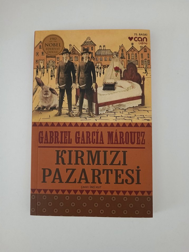Gabriel García Márquez'in "Kırmızı Pazartesi" romanı, nostaljik illüstrasyonlar ve sıcak tonlarla kaplanmış.