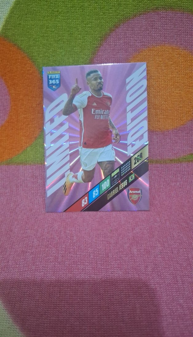 Gabriel Jesus'un yer aldığı, pembe renkli pop kültür ve athleisure tarzında erkek rozeti. "Emirat" yazısı ve oyuncu istatistikleri bulunur. ⚽