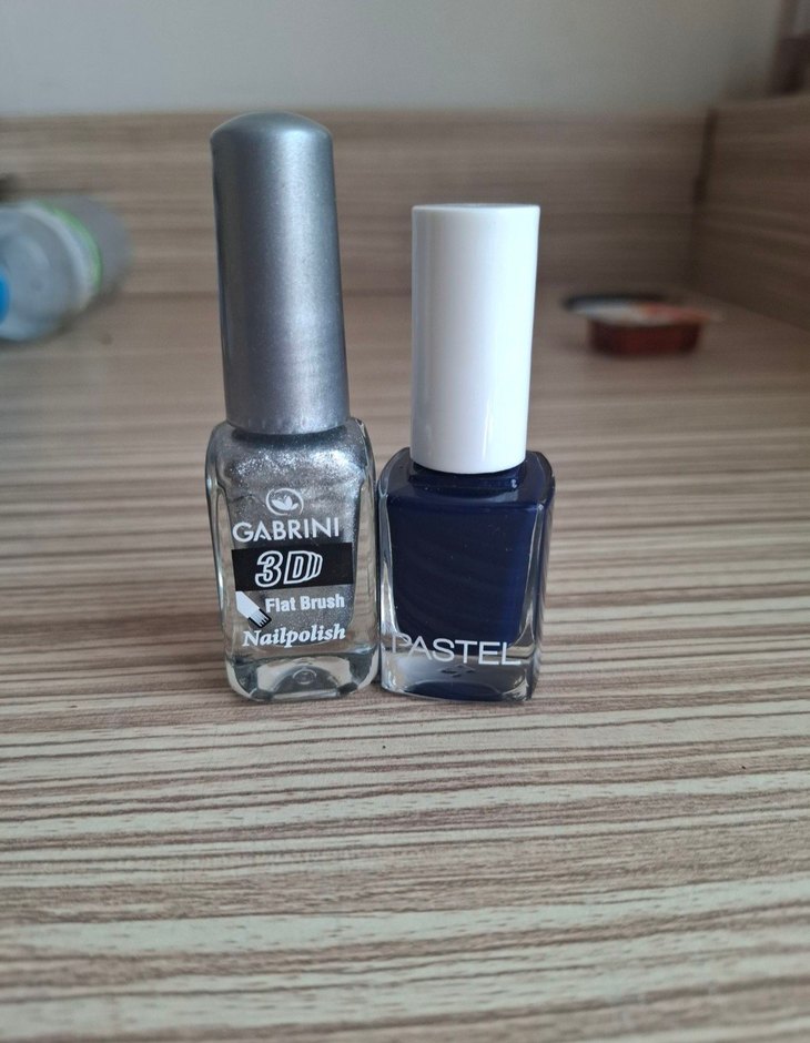 Gabrini'nin 3D gri ojesi flat fırçaya sahip, yanında koyu mavi Pastel oje setiyle birlikte.