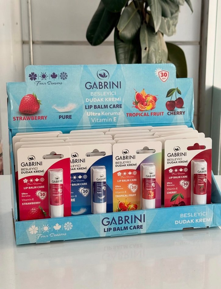 Gabrini dudak kremi, Vitamin E ile ultra koruma sağlar. Çilek, saf, tropikal meyve ve kiraz olmak üzere dört renkli çeşidi vardır.