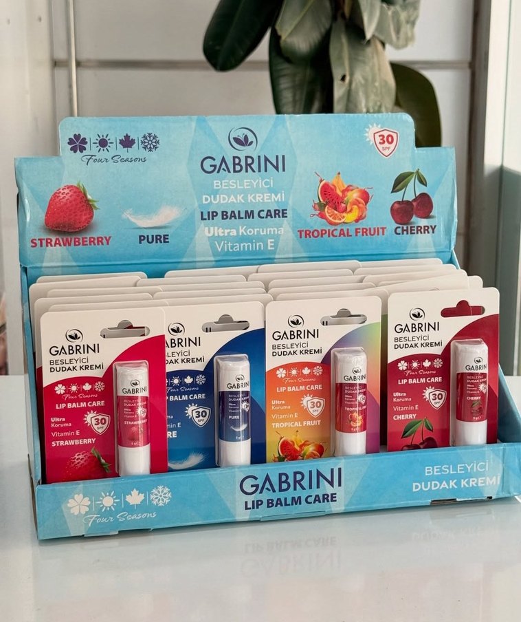 Gabrini dudak kremleri nemlendirici, vitamin E ve SPF 30 koruması ile besleyici bakım sunar. Çilek, tropikal meyve ve kiraz gibi renkli çeşitleri mevcuttur.