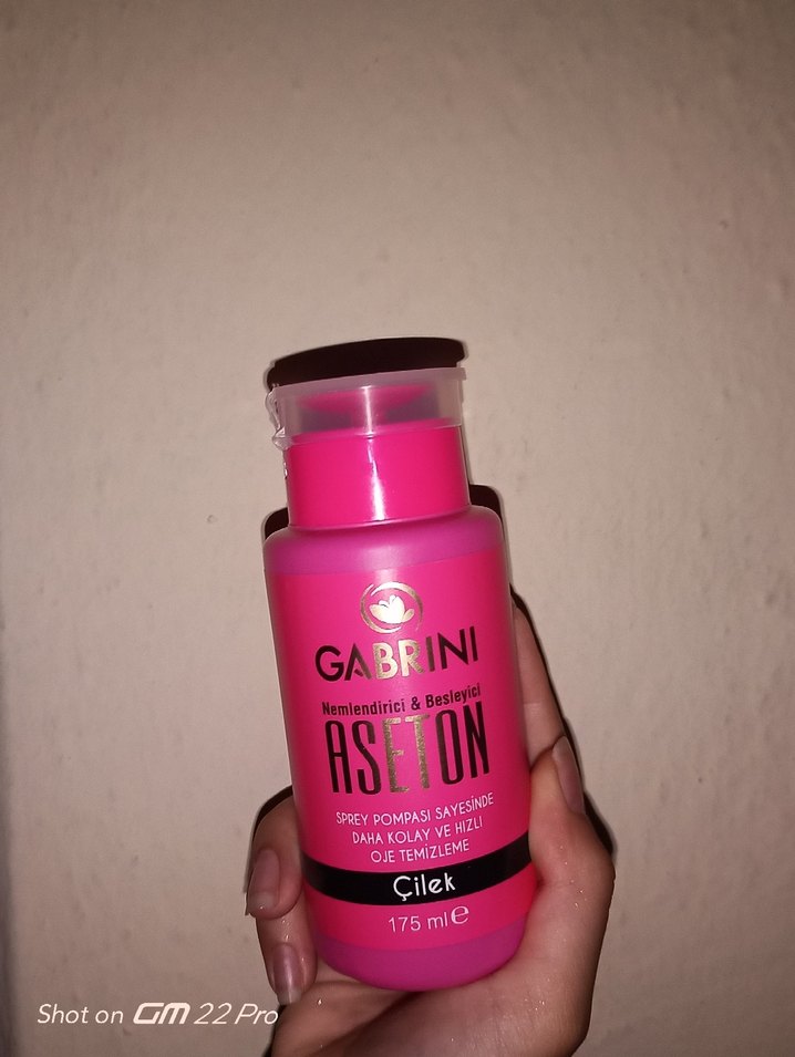 Gabrini çilek kokulu aseton, sprey pompası ile daha kolay ve hijyenik kullanım sağlar. 175 ml hacmindedir. hiç kullanılmamış sıfır
