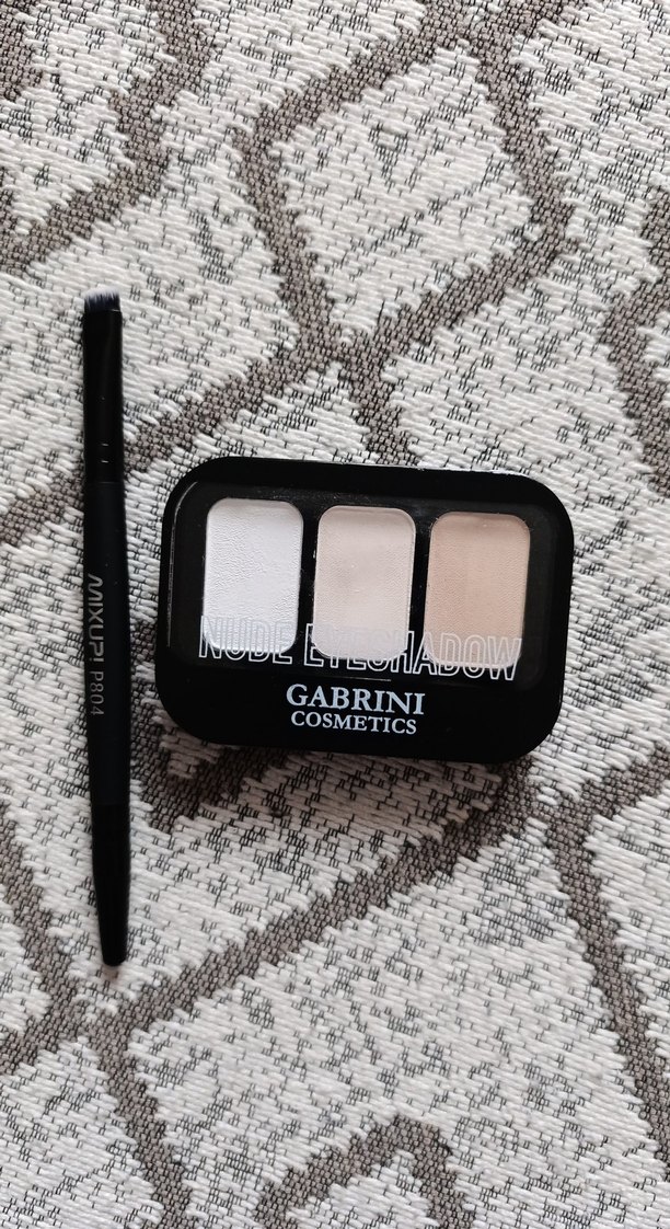 Gabrini Cosmetics nude göz farı paleti, üç bej tonu ve uygulama fırçası içerir. Açık ve orta bej renklerle çeşitli göz makyajları yapılabilir.