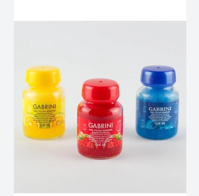 Gabrini oje temizleyici üç farklı kokulu ve formüle sahip renkli şişelerden oluşur. Oje temizleme için nazik formüller içerir.