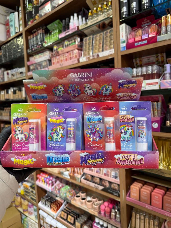Gabrini lip balm seti, yaban mersini ve çilek gibi farklı meyve kokularında renkli tüpler içerir. Her balm dudak bakımı sağlar ve eğlenceli unicorn tasarımlıdır.