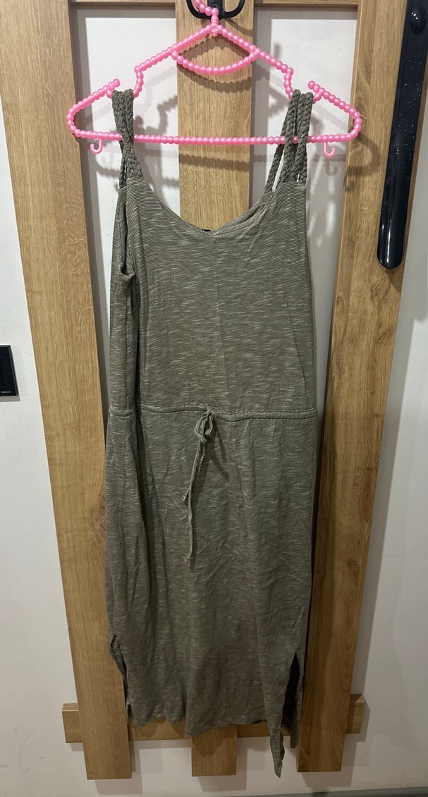 Yumuşak keten kumaştan, kemerli ve askılı, salaş kesim midi elbise. günlük rahat kullanım için uygundur. Plaj için de uygun