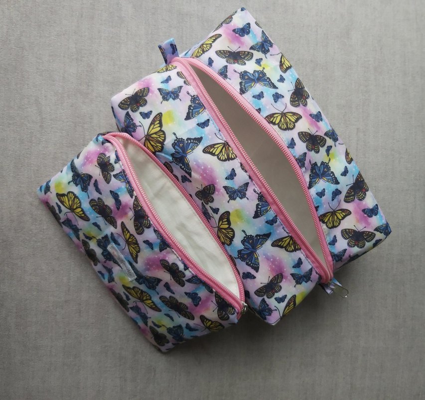 Kadın makyaj çantası, pastel çok renkli kelebek baskılı ve fermuarlı. Sentetik kumaştan, günlük kullanım için minimal, bohem tarzda. Ölçüler: 24x14x8cm/20,5x13cm Ürün tamamen el emeğidir. Stoğu 1 adettir. 2'li set olarak satışa sunulmuştur. 30°'de hassas yıkama önerilir. Leke çıkarıcı ve çamaşır suyu kullanılmamalıdır.
