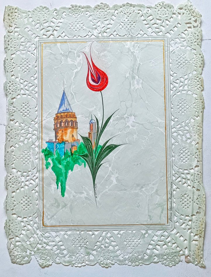 Kırmızı lale ve Galata Kulesi'nin yer aldığı beyaz, dokulu zemin üzerinde dantel görünümlü kenarlıklı tablo. eser ince oyma kağıt üzerine yapılmış olup istenilen rengin zerine murakka yapılabilir. orjina el yapımıdır. Ebru üzeri suluboyadır